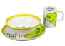 Komplet śniadaniowy składający się z talerzyka, miseczki oraz kubka - całość spakowana w gustowne, prezentowe opakowanie.